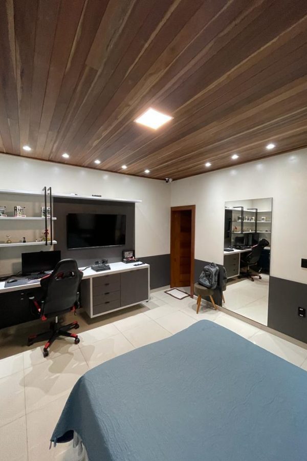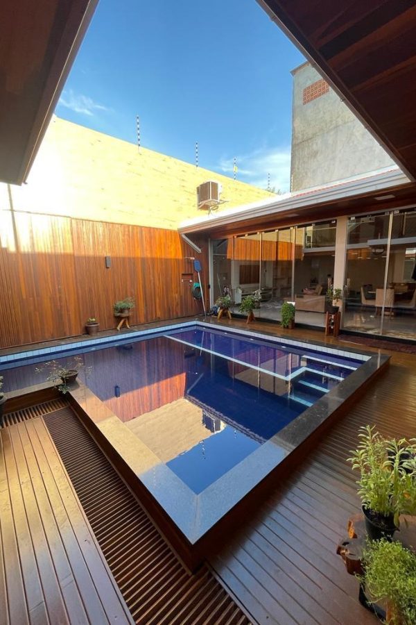 Os ambientes foram cuidadosamente planejados, com móveis planejados, centrais de ar-condicionado em todos os cômodos e sistema de automação, oferecendo praticidade e modernidade. A residência possui amplas aberturas em madeira Cumaru, acabamento em assoalho de Ipê vermelho e fechamento em Blindex, valorizando a iluminação natural e o design sofisticado.